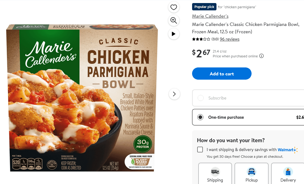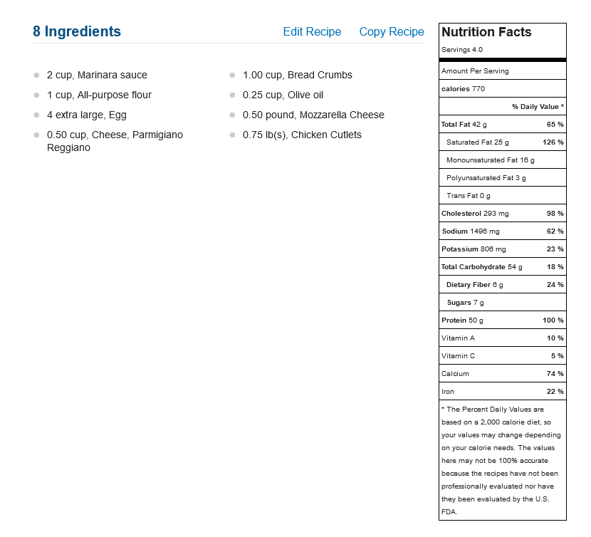 Today we’re going to pick on Marie Callender’s Classic Chicken Parmigiana Bowl for $2.67. Ingredient-wise, it’s a good choice for an instant meal. Chicken breasts are inherently high in sodium, but Marie Callender’s is still greater than the recipe we’re about to use. Otherwise, overall, the nutrition panels are pretty comparable between the store-bought and homemade, with each having its strengths and weaknesses.